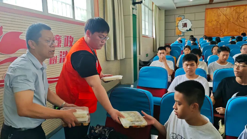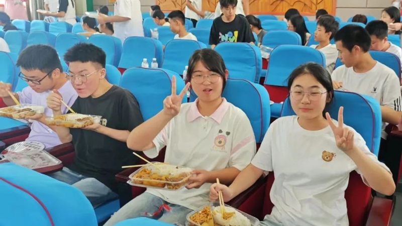 考生们进入教学楼后,社会组织的服务仍未停歇。“大家先在这稍作休息,马上给你们分发午餐。”社会组织的伙伴们抬着装满食物和饮品的箱子来到候考区。热气腾腾的饭菜、瓶装矿泉水,还有清凉用的扇子,一一送到考生手中。“这里休息很舒服,下午我一定可以好好考试!”考生小吴拿着扇子,脸上露出了轻松的笑容。